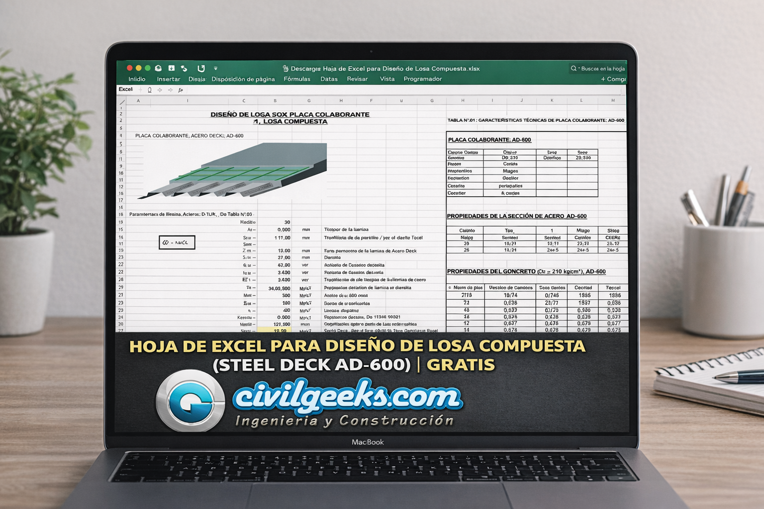 Descargar Hoja de Excel para Diseño de Losa Compuesta (Steel Deck AD-600)
