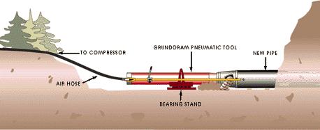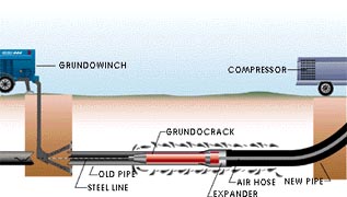 Esta modalidad consiste en  efectivos martilleos a través de la tubería de acogida, desplazando a los fragmentos en el suelo circundante, al mismo tiempo tirando de la nueva tubería, por lo general Polietileno de Alta Densidad (HDPE).  Pipebursting es el único método de zanjas de sustitución que permite el tamaño la tubería original.
