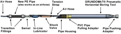 El Grundomat también es fácilmente configurado para empujar la tubería (extracción) . Durante la extracción de la tubería, otra tubería, empujando el adaptador se coloca en la parte frontal de la herramienta de perforación. La fuerza de percusión es como una  herramienta que  se utiliza para conducir literalmente a cabo una línea de servicio existente.