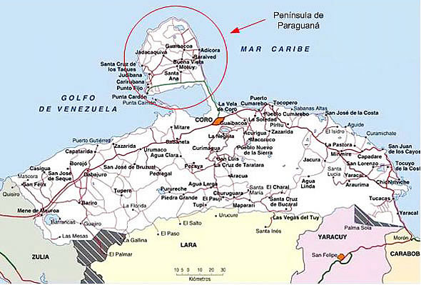 Las penínsulas de la Guajira y Paraguana son barridas casi todo el año por los vientos alisios que soplan desde el mar caribe con rumbo nordeste suroeste. Esta dos penínsulas, las mas septentrionales de América del sur, conforman, conjuntamente con las mas sureñas de las Antillas menores (Aruba, Curazao y Bonaire) el Cinturón Árido Pericaribeño.