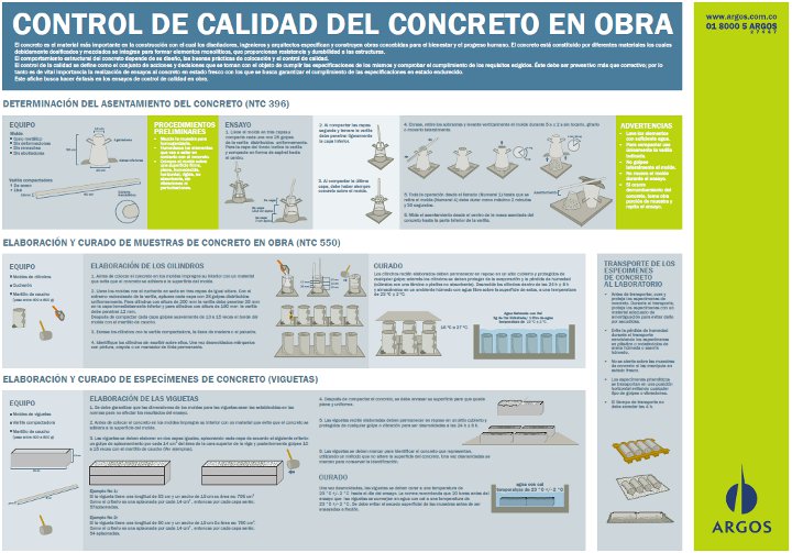 El control de la calidad se define como el conjunto de acciones y decisiones que se toman con el objeto de cumplir las especificaciones de los mismos y comprobar el cumplimiento de los requisitos exigidos. Éste debe ser preventivo más que correctivo; por lo tanto es de vital importancia la realización de ensayos al concreto en estado fresco con los que se busca garantizar el cumplimiento de las especificaciones en estado endurecido. Este afiche busca hacer énfasis en los ensayos de control de calidad en obra.