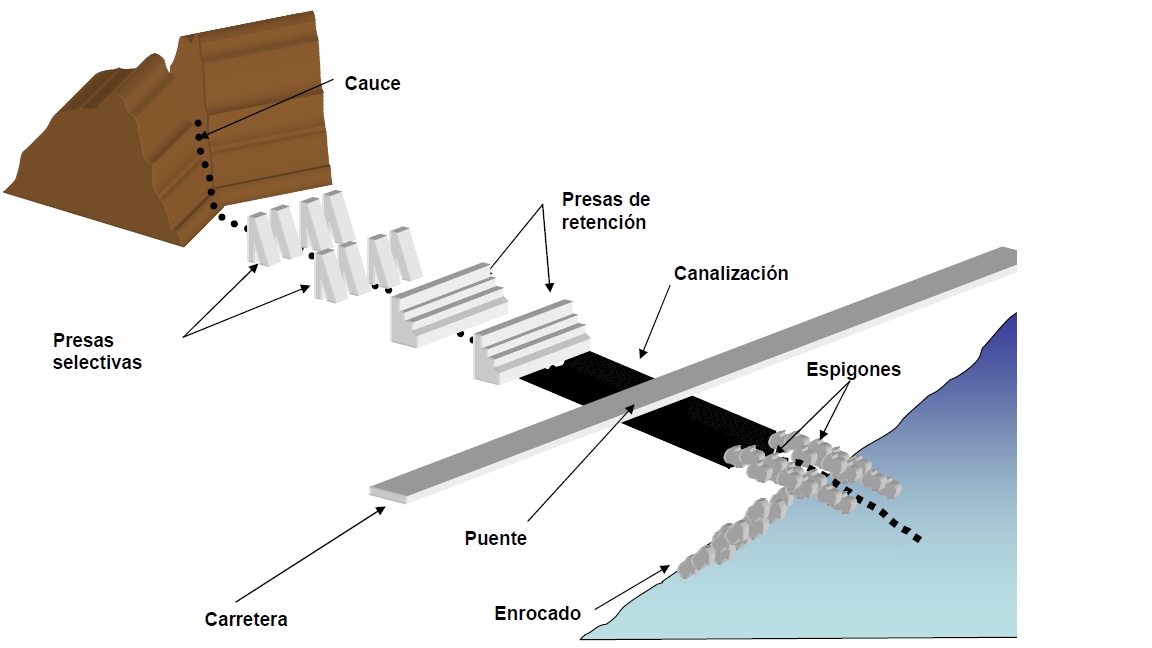 – Diques con material de cauce y protección de escollera.