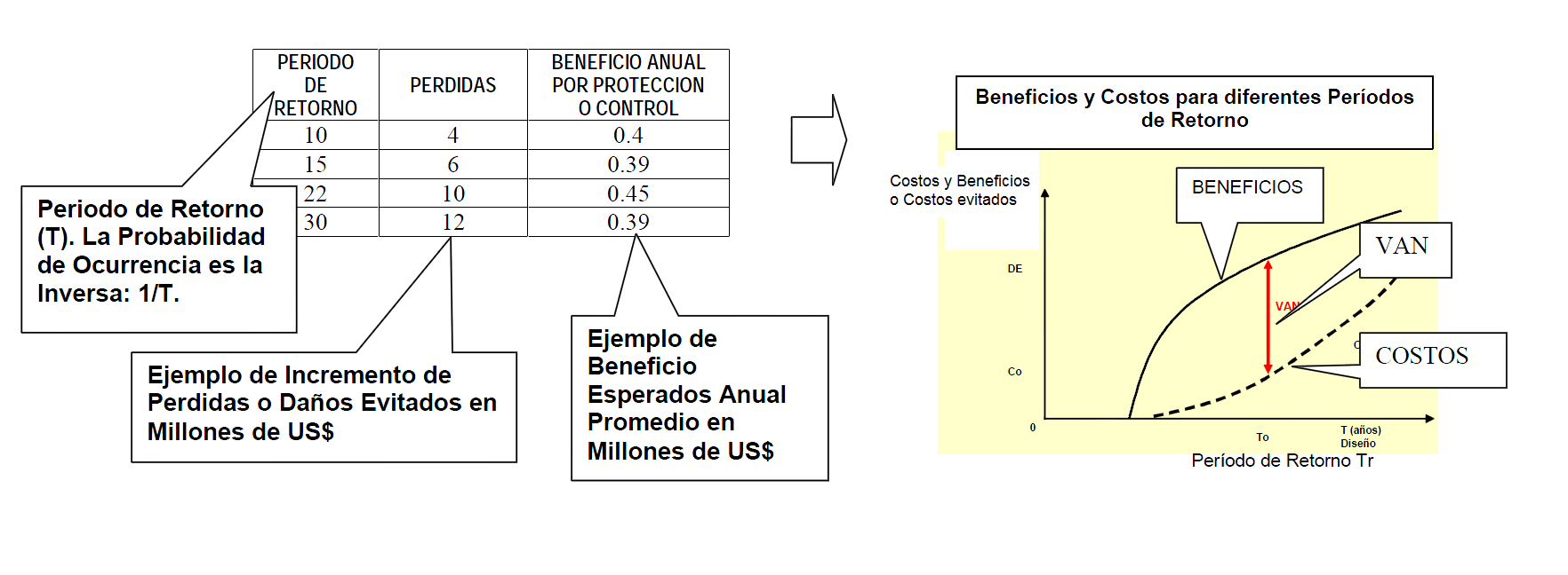 El investigador español J. M. Vide, propone en muchas de sus publicaciones que como en otras obras de ingeniería hidráulica, al discernir sobre el caudal de diseño debemos considerar que para el diseño de un encauzamiento no se puede responder a esta interrogante previa sin tener en cuenta aparte de los aspectos técnicos los aspectos económicos y legales. Los Beneficios Esperados Anuales Promedio de un Proyecto, pueden calcularse multiplicando aquellos beneficios esperados al evitar la inundación en un nivel determinado por la Probabilidad de ocurrencia de ese nivel en cualquier año: 1/T, T Período de retorno.