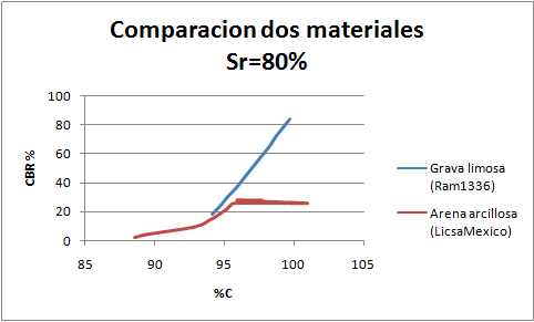 Si el requerimiento de resistencia del proyecto fuera 20% de CBR, cualquiera de los dos materiales serviría compactándolo al menos al 95% del Proctor.