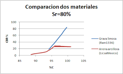 En cambio, si la resistencia requerida fuera 40%, a la grava habría que compactarla al menos al 96% del Proctor, mientras que la arcilla, digamos, no alcanzaría tal resistencia ni compactándola a más de 100% del Proctor.