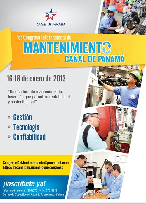 La Autoridad del Canal de Panamá organiza el Primer Congreso Internacional de Mantenimiento, Canal de Panamá 2013, durante los días 16,17 y 18 de enero de 2013. El evento se realizará en el Centro de Capacitación Ascanio Arosemena, ubicado en Balboa.
