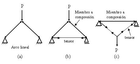 Como se ve en la figura anexa, la unión entre dos puntos puede hacerse con un arco lineal formado por dos elementos inclinados a compresión (figura a), restringidos por dos apoyos que le dan el empuje para que no se abran; el empuje horizontal puede reemplazarse por un tensor que una los dos elementos inclinados, con lo que se libera a los apoyos del empuje hacia fuera, figura (b). También puede soportarse la carga con dos tensores y un elemento horizontal a compresión, figura (c). Este caso es más escaso pues debe tenerse espacio libre debajo para desarrollar los tirantes. Esta disposición triangular permite soportar una carga fácilmente, con una deflexión muy pequeña si se la compara con la de una viga de igual luz. La viga permite sin embargo usar una altura transversal pequeña.