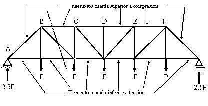 Si las cargas se aplican exclusivamente en los nudos (figura b), como es lo usual, no se produce la flexión que se presenta (figura a) en los arcos cuando se aplican cargas concentradas. En cerchas de cubiertas en las cuales las cargas son livianas es común aceptar que las cargas no se apliquen en los nudos, pero deberá evaluarse la combinación de efectos de flexión y compresión. Figura Flexión por cargas interiores vs. cargas en los nudos En general en las cerchas cuando se aplican las cargas en los nudos solo se presentan fuerzas internas de tipo axial que se reparten de manera semejante a lo presentado en las vigas; los miembros de la cuerda inferior están a tensión y los miembros de la cuerda superior a compresión.