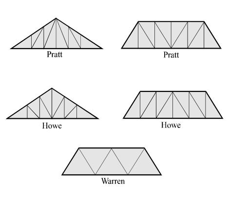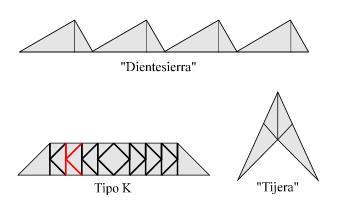 Existen numerosas clasificaciones de las cerchas según su inventor o propagador: Pratt, Howe, Warren; y según su forma: dientesierra, tijera, tipo K.