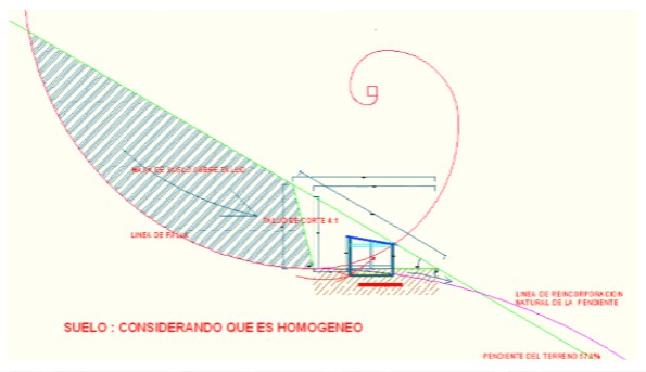 Cabe indicar como teoría que la supuesta falla que se muestra en la figura corresponde a un suelo cuya característica es homogénea donde estamos considerando que el suelo es arcilloso con grava, y al humedecerse superficialmente tiende a buscar un equilibrio natural cuyo resultado es el desprendimiento.