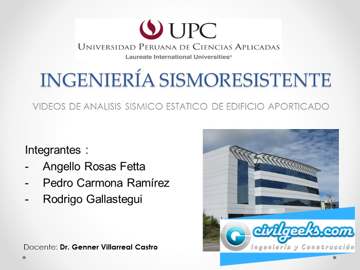 Podrán bajar los Mejores Videos de ANALISIS SISMICO ESTATICO DE EDIFICIO APORTICADO, elaborados por los alumnos de los cursos Ingeniería Sismo-Resistente, Ingeniería Antisísmica I e Ingeniería Sísmica, dictado por el Dr. Genner Villarreal Castro en la Carrera de Ingeniería Civil de la Universidad Peruana de Ciencias Aplicadas, Escuela de Ingeniería Civil de la Universidad de San Martín de Porres y Escuela de Ingeniería Civil de la Universidad Privada Antenor Orrego, correspondiente al ciclo 2013-I. Para ello, hagan click en los siguientes enlaces: