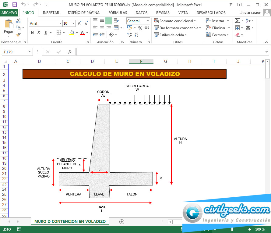 Excel con detalles de acero en muro de contención en voladizo o muro en Catilever.