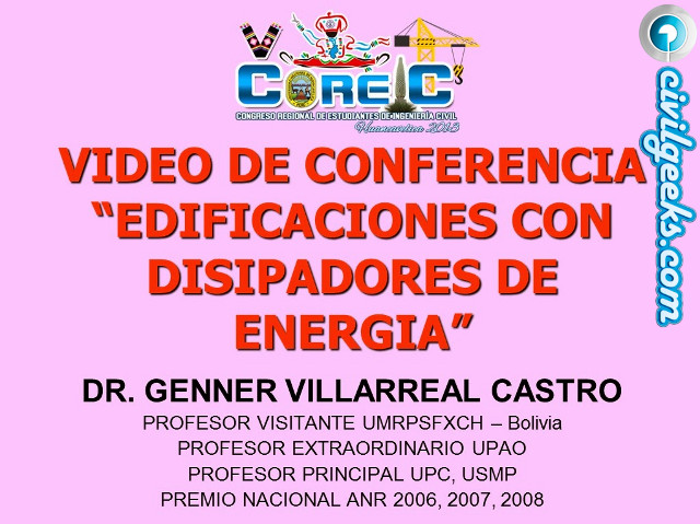 Podrán bajar el Video de la Conferencia «EDIFICACIONES CON DISIPADORES DE ENERGIA«, dictado por el Ph.D. Genner Villarreal Castro en la bella ciudad de Huancavelica, con motivo de la realización del V Congreso Regional de Estudiantes de Ingeniería Civil (V COREIC).