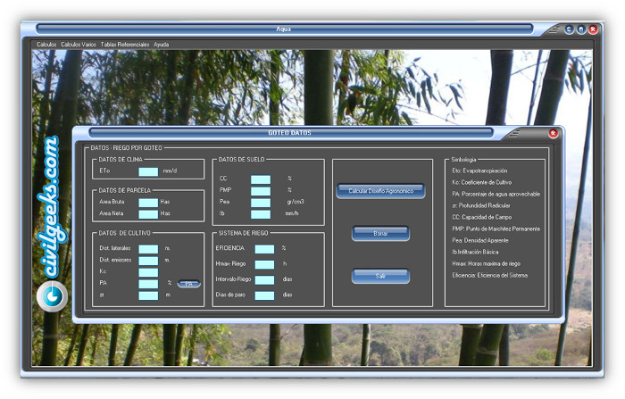 Gracias al Ing. Marco Vinicio Veintimilla Calva por crear y compartir tan interesante programa para el diseño de sistemas de riego. El software AQUA y es muy versátil ya que nos facilita el proceso de diseño de sistemas de riego. Lo mejor des que AQUA v1.0 es gratis y sin restricciones.