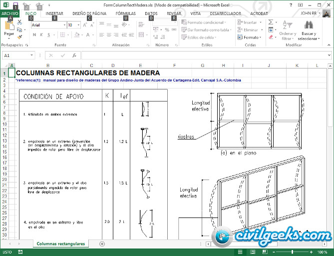 La hoja excel de columnas de madera verifica a compresión, flexocompresión y flexotración.