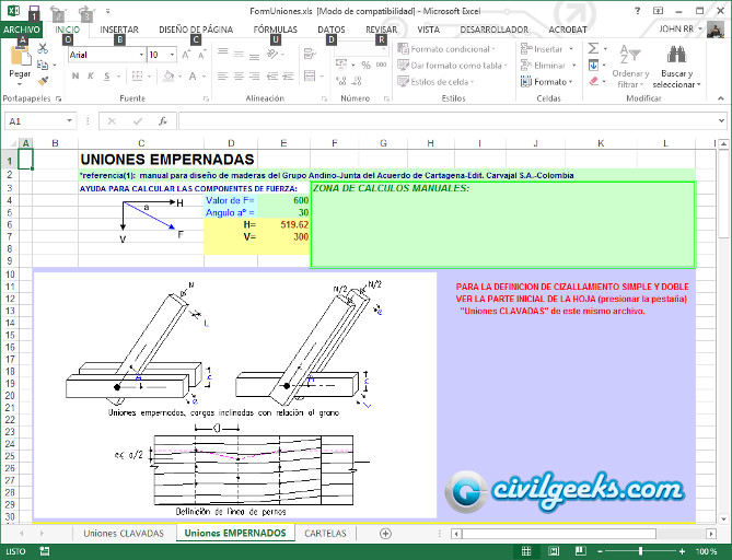 Hoja excel para diseño de uniones clavadas y empernadas de manera basado en el manual para diseño de maderas del Grupo Andino.