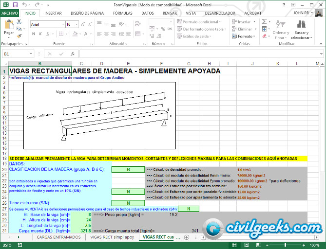Hoja excel para diseño de vigas de madera basado en el manual de diseño de madera para el Grupo Andino.