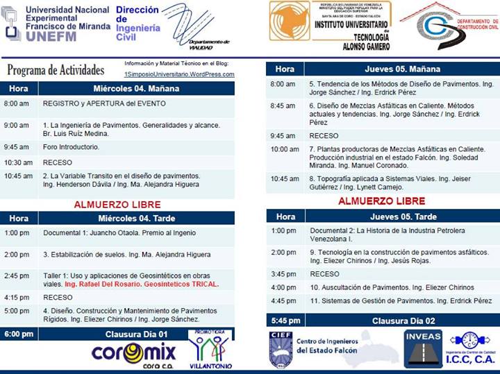 El comité organizador del 1er Simposio Universitario en Ingeniería de Pavimentos, la Universidad Nacional Experimental Francisco de Miranda (UNEFM) y el Instituto Universitario de Tecnología Alonso Gamero (IUTAG) les invita a participar en 1er. Simposio Universitario en Ingeniería de Pavimentos, a realizarse en la ciudad de Santa Ana de Coro, del 4 al 6 de Junio de 2014.