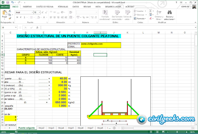 muy importante dicho aporte de diseño puente colgante peatonal. cual es la clave del la hoja excel