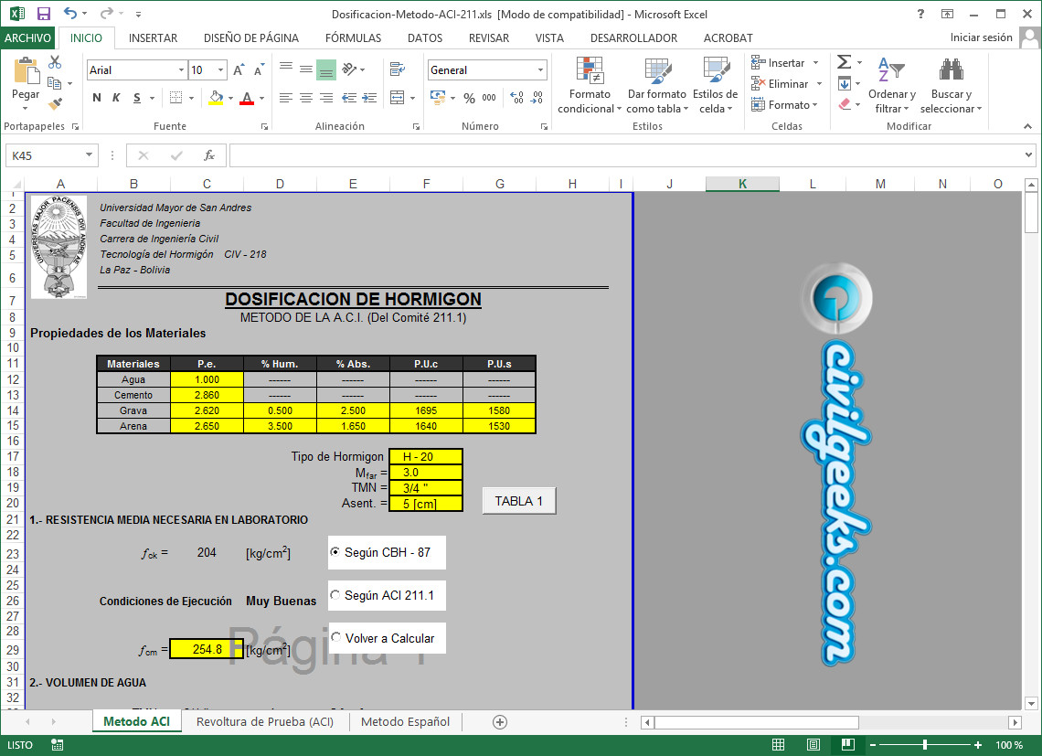 Hoja excel para diseño de mezclas de concreto por el método de la ACI (del comité 211.1)