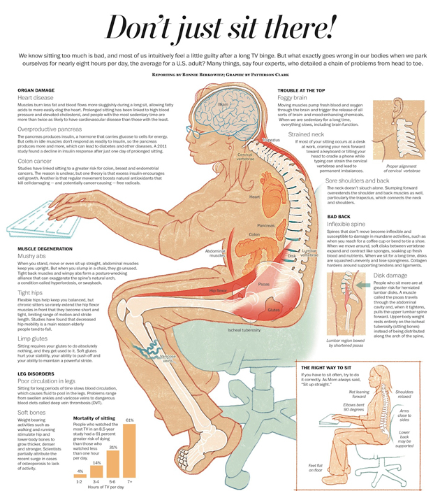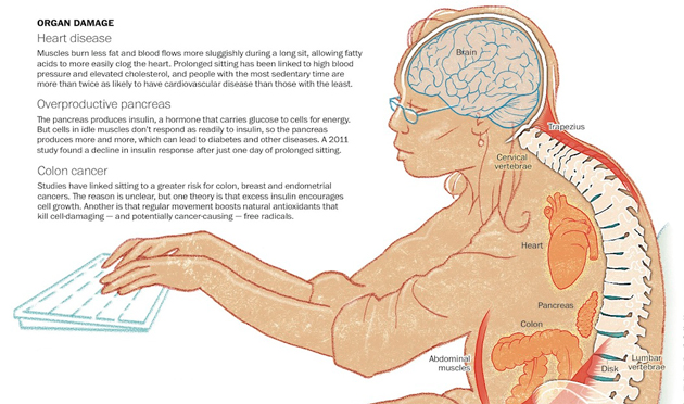 La gente normalmente confunde sentarse con relajarse, pero el problema es que si pasas la mayor parte del día sentado lo que estás haciendo es matarte lentamente. O al menos eso es lo que los cuatro expertos que desarrollaron este infográfico te dicen. Si eres un esclavo encadenado a tu computadora, destinado a golpear teclas todo el día, deberías pensar al menos en tomarte algunos minutos cada hora para caminar un poco, mejorar tu postura cuando estás sentado y en general tratar de hacer ejercicio y tener otro tipo de actividades que mantengan tu cuerpo ejercitado.