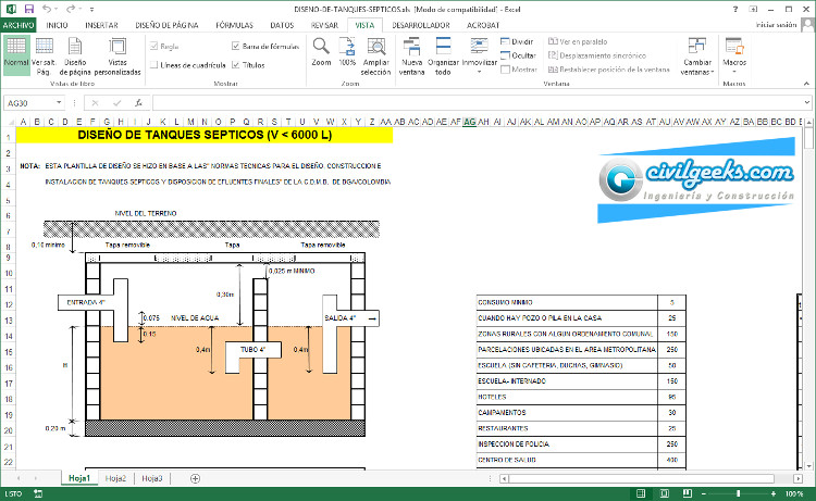 Esta hoja excel de diseño de tanques sépticos se hizo en base a las» normas técnicas para el diseño, construcción e instalación de tanques sépticos y disposición de efluentes finales» de la C.D.M.B. de BGA/Colombia.