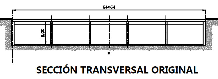 Se concursó la obra utilizando un proyecto estructural hecho por una compañía constructora, que especificaba muros de contención perimetrales verticales de 8 m de altura, y una losa de concreto para maniobras de camiones de combustóleo, apoyada en columnas y zapatas de concreto reforzado, como se muestra en el corte siguiente.
