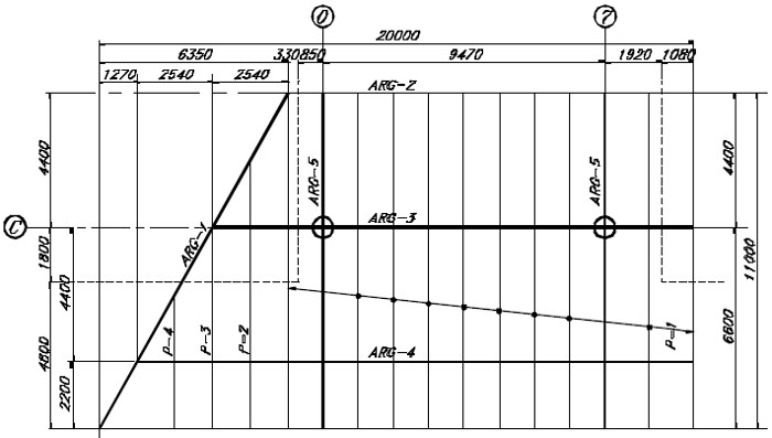 Debido a su forma y excentricidad la estructura tenía un factor de dificultad muy superior al promedio: para solo 200 m2 en planta se necesitaron 5 tipos de armaduras longitudinales y 4 tipos de polines, como se muestra en la figura anterior. Permítanme decir, para comparación, que poco tiempo antes hice el diseño de una cubierta rectangular de 20,000 m2, – ¡100 veces más grande! –, que se resolvió con solo dos tipos de armaduras y un solo tipo de larguero. El ala