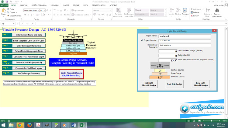 Esta hoja excel (Excel de diseño de pavimentos flexibles para aeropuertos) fue diseñada para producir espesores de pavimentos flexibles de acuerdo con la CA consultiva 150/5320-6D de la circular de FAA , el diseño del pavimentos flexibles del aeropuerto y la evaluación.