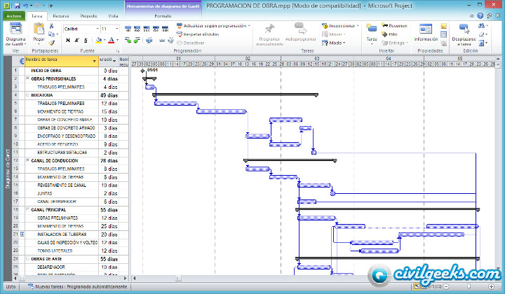 Saludos amigos de civilgeeks.com. Luego de unas semanas sin compartir archivos para ingeniería civil, hoy voy a compartir ejemplos de programación de obras con el programa MS Proyect. Las programaciones de son de proyectos reales de canales de riego y obras hidráulicas.