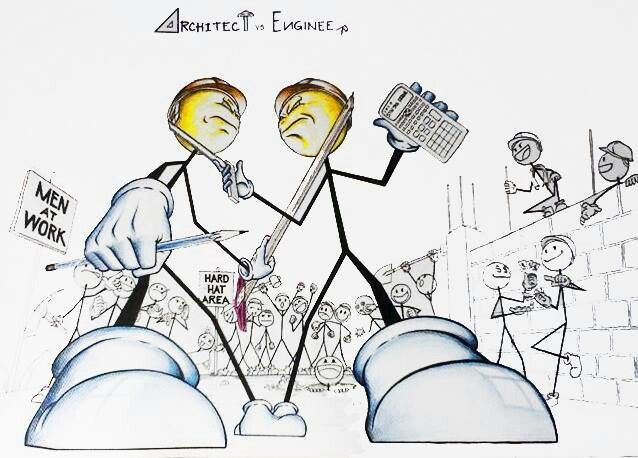 La verdad lo primero que aprendí mi primer día de clases en la universidad, de los estudiantes de ultimo año era que los arquitectos no eran lo suficientemente hombres para estudiar ingeniería civil o lo suficientemente desviados para estudiar diseños de interiores jajajaja, reíamos con eso toda la carrera, pero la verdad es que ambas se nesesitan y los mejores proyectos que he desarrollado a sido en conjunto con un arquitecto es como si se comolementaran, hoy en en día uno de mis mejores amigos de la infancia es arquitecto y trabajamos juntos y los chistes siguen surgiendo pero el respeto y el profesionalismo es siempre la clave saludos