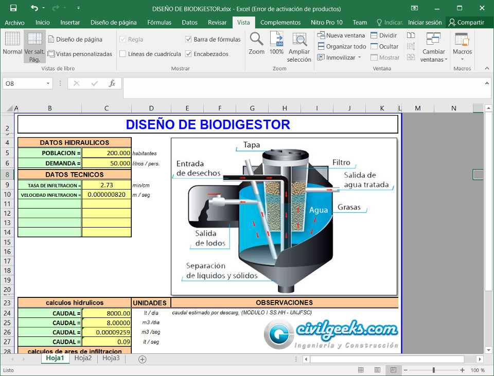 Amigo, el archivo te funciona? tiene todos los cálculos? Está incompleto, porque no arroja el cálculo de los volúmenes de las diferentes seeciones del digestor, ni la cantidad requerida de relleno en el biofiltro. Así es lo que yo bajé, mira la imagen -> http://prntscr.com/hrn6sp