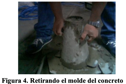 - Retire el molde del concreto, levantándolo cuidadosamente en dirección vertical. Eleve el molde una distancia de 30 cm en 5 ± 2 segundos, firmemente y evitando cualquier movimiento lateral o de torsión.