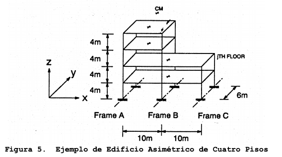 El ejemplo del PDF analiza un edificio asimétrico de 4 niveles (Figura 5, página 11).