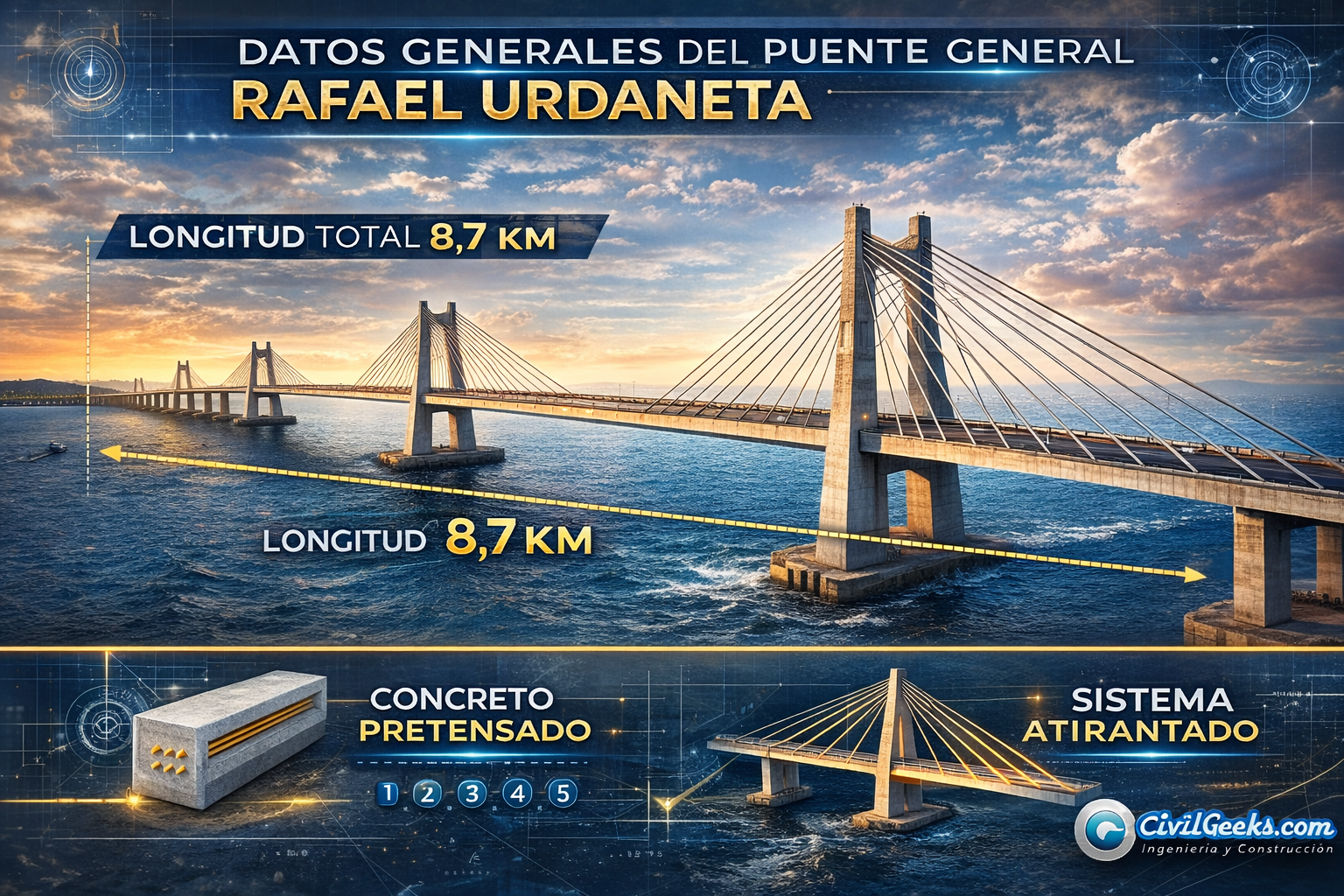 - Sistema estructural principal: Puente atirantado de concreto pretensado