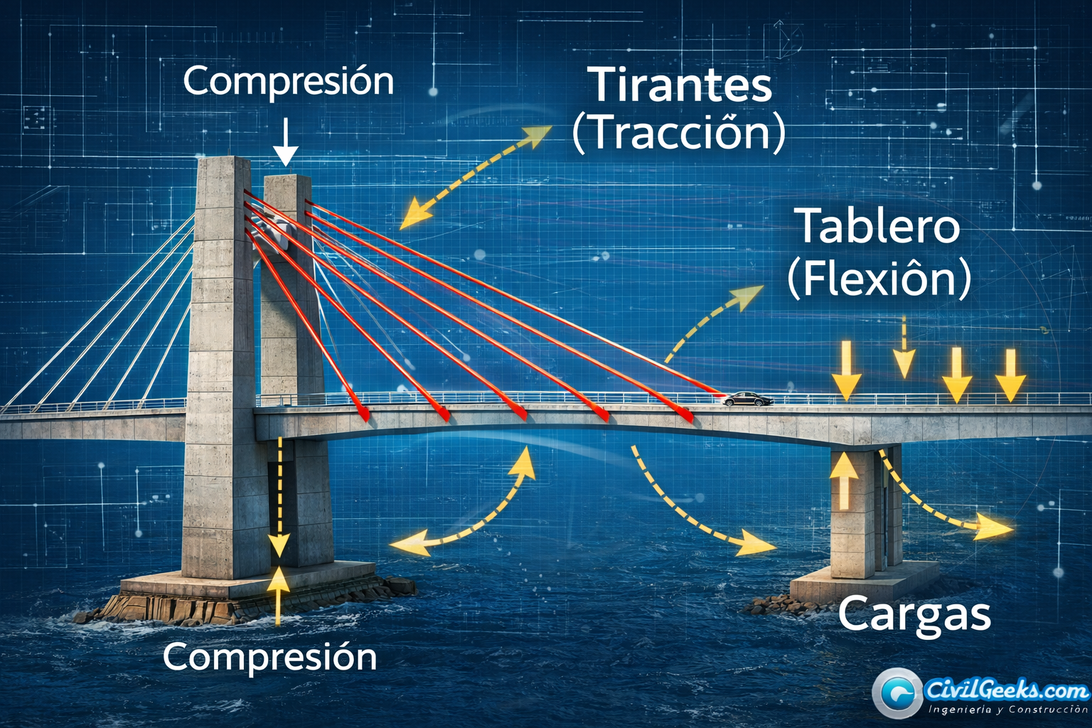 - Los tirantes transmiten esfuerzos de tracción hacia los pilones.